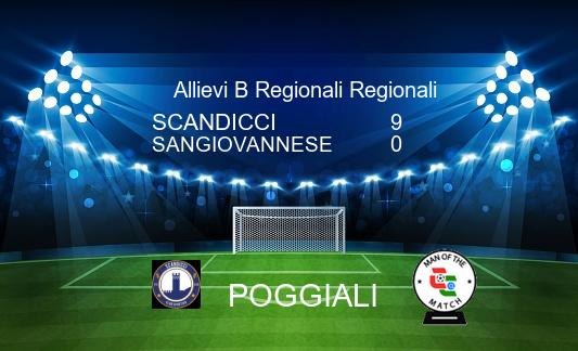 Media SCANDICCI 9-0 SANGIOVANNESE 14/03 - 18.30.00 - Risultato Finale Ris.verificato Ins.Foto Ins.Commento Arbitro: Daniel Vannoni sez.Prato 10' Poggiali 20' Poggiali 22' Londi 43' Brahimaj 55' Zani 60' Zani 65' Cardella 70' Cardella 75' Deliperi Ins.Form. Ins.MVP. Ins.Form. Ins.MVP.