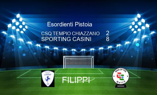 Gran vittoria in rimonta a Chiazzano per lo Sporting Casini, che ribalta il risultato nel secondo e terzo tempino, dopo esser finito sotto di due reti nel primo. Dopo un buon inizio dei quarratini, vivaci ma poco ispirati sotto rete, sale in cattedra il Tempio, che sfrutta sostanzialmente le uniche due occasioni create e si porta sul 2-0 grazie alle reti di Rrotani e Grandini. Nel secondo tempo un Casini per niente demoralizzato torna a macinare campo e a insistere in fase offensiva, trovando immediatamente il gol con Filippi, che accorcia le distanze. Il Casini continua a spingere e nei minuti successivi, tra secondo e terzo tempino, segna altre sette reti, trascinato da un Filippi in giornata di grazia e da Palma, che realizza una doppietta. In gol anche Cuomo e Campo. Per il Tempio, qualche contropiede, ben controllato però dai due portieri quarratini, che si sono alternati.