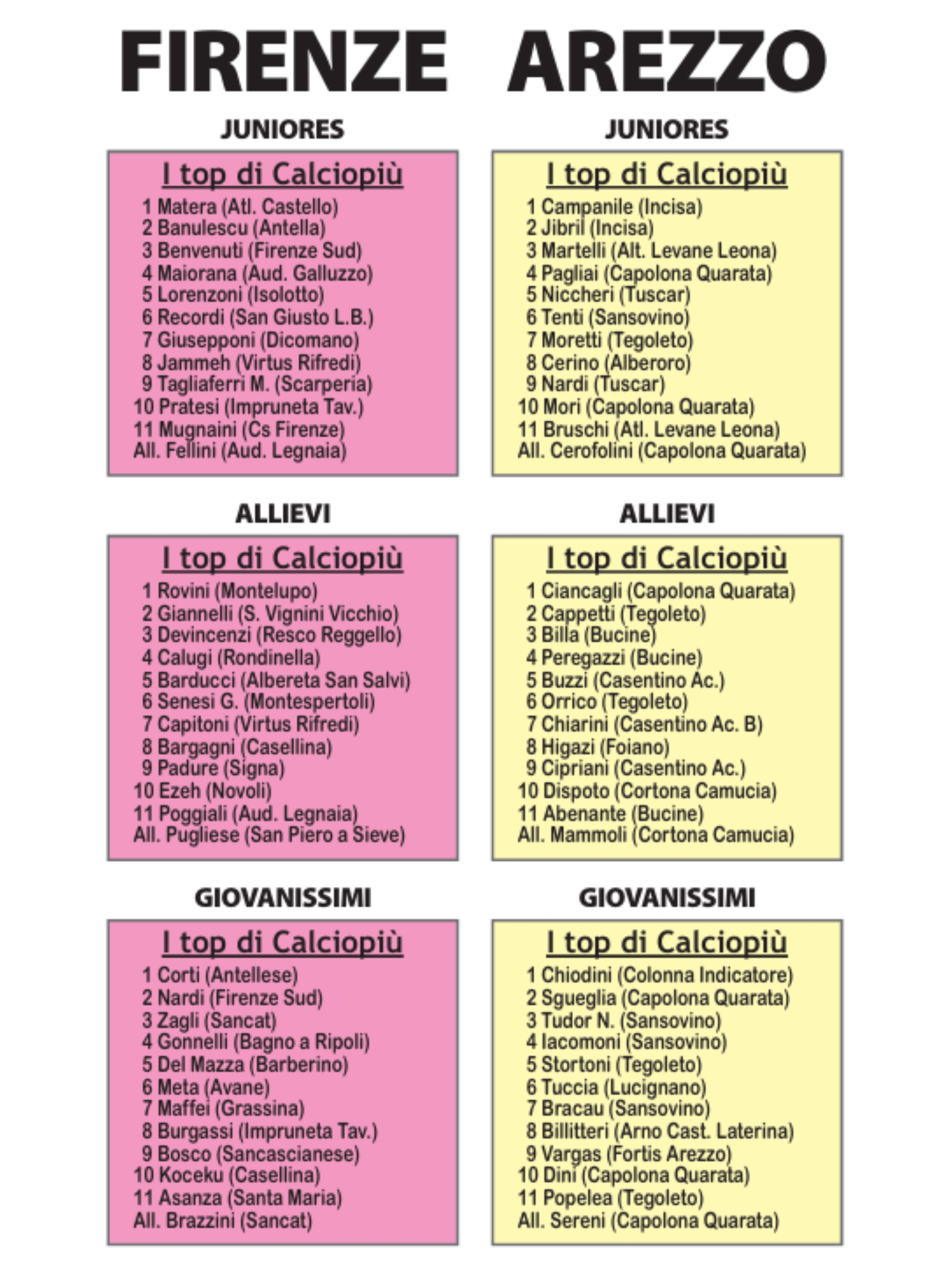Firenze e Arezzo: le Top 11 di Juniores, Allievi e Giovanissimi