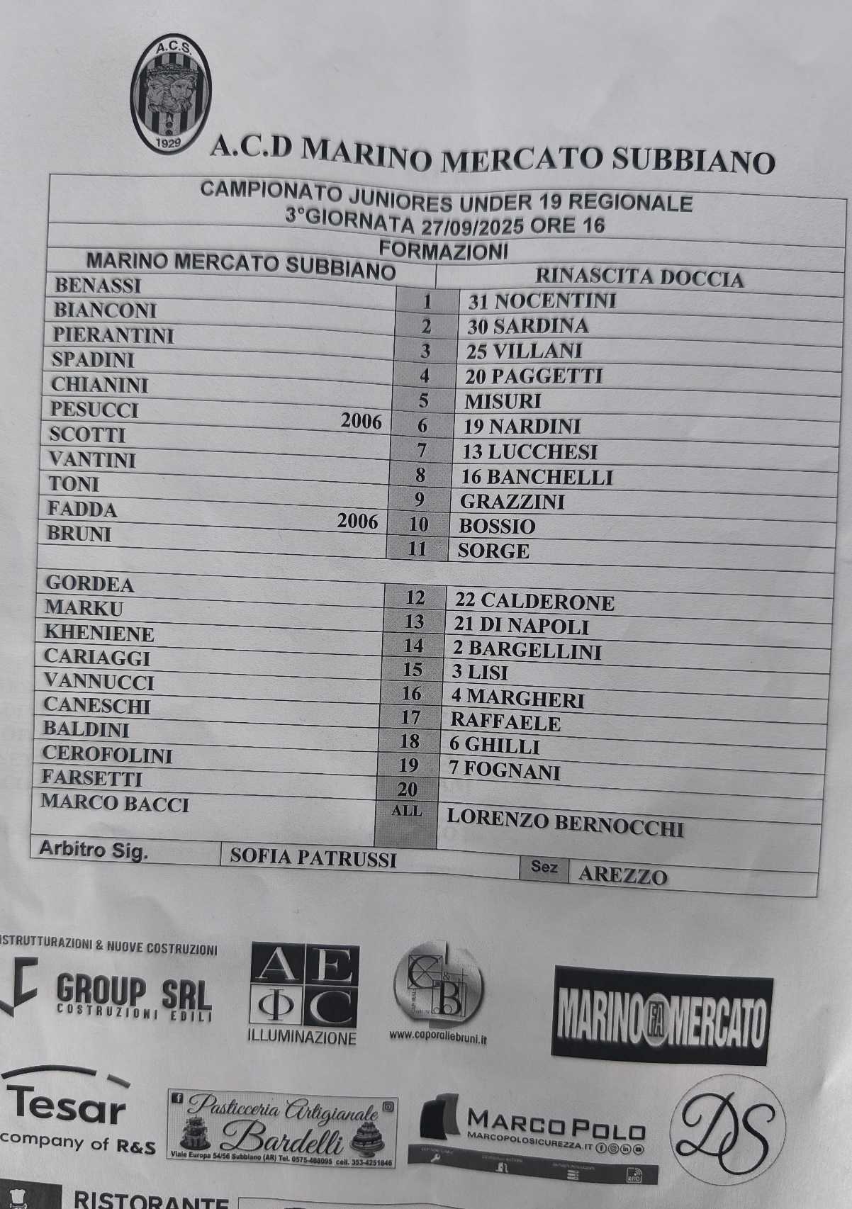 Juniores Regionali GIR.D M.M. SUBBIANO - RINASCITA DOCCIA - 27/09/2025 0 - 3