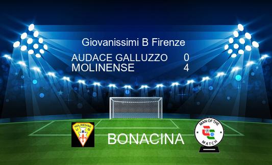 La doppietta di un super Bonacina e i timbri di Salvadori e Rotundo stendono l'Audace Galluzzo; la Molinense si impone sui padroni di casa per 4-0 e conquista la quarta vittoria in campionato. Offrono una grande prova di squadra gli ospiti, che grazie alla doppietta di Bonacina, coronano l'ottimo momento e mettono in discesa la gara. Non ha intenzione di fermarsi la Molinense, che prima metta dentro la terza rete di giornata con Salvadori e poi chiude la pratica con il sigillo di Rotundo per il definitivo 0-4. Triplice fischio dell'arbitro che manda tutti sotto la doccia; vince così una